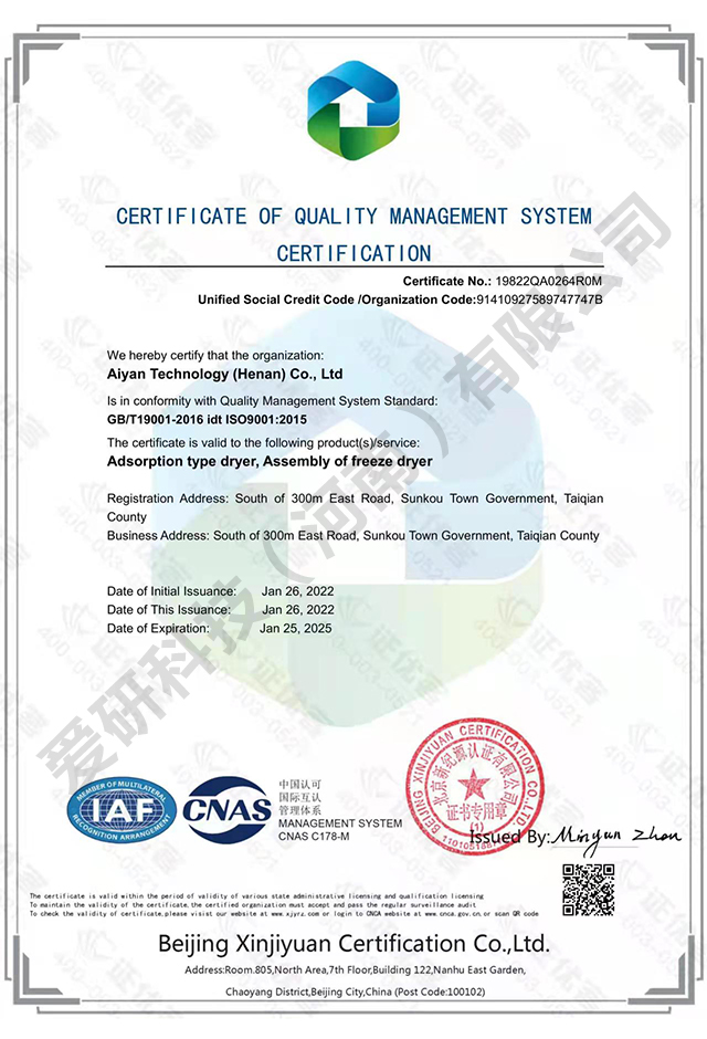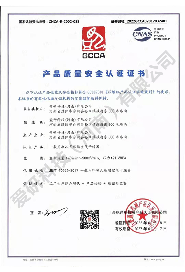 产品质量安全认证证书-冷干机