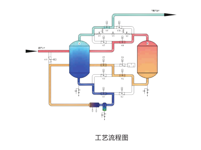 再生桶使用高温的压缩空气,送入再生桶中对吸附剂进行加热再生,再通过冷却器冷却到合适的温度,送入吸附塔进行吸附。加热再生完成后使用出口的低温成品气对再生桶进行冷却再生,使温度降低到正常工作范围。