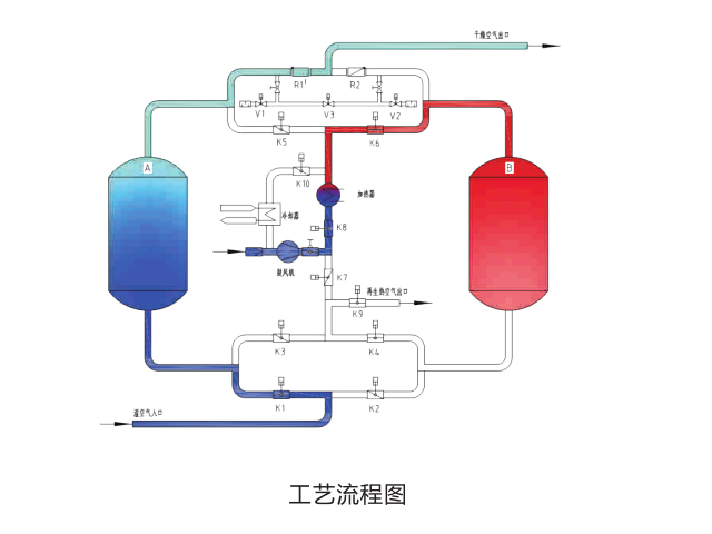 再生桶使用鼓风机抽取外部大气进行加热,送入再生桶中对吸附剂进行加热再生,加热再生完成后使用抽取桶内的高温空气, 通过冷却器冷却, 在使用鼓风机送入到桶内冷却。整个冷却器密闭循环,防止外部对已经完成再生的吸附剂的二次吸附。